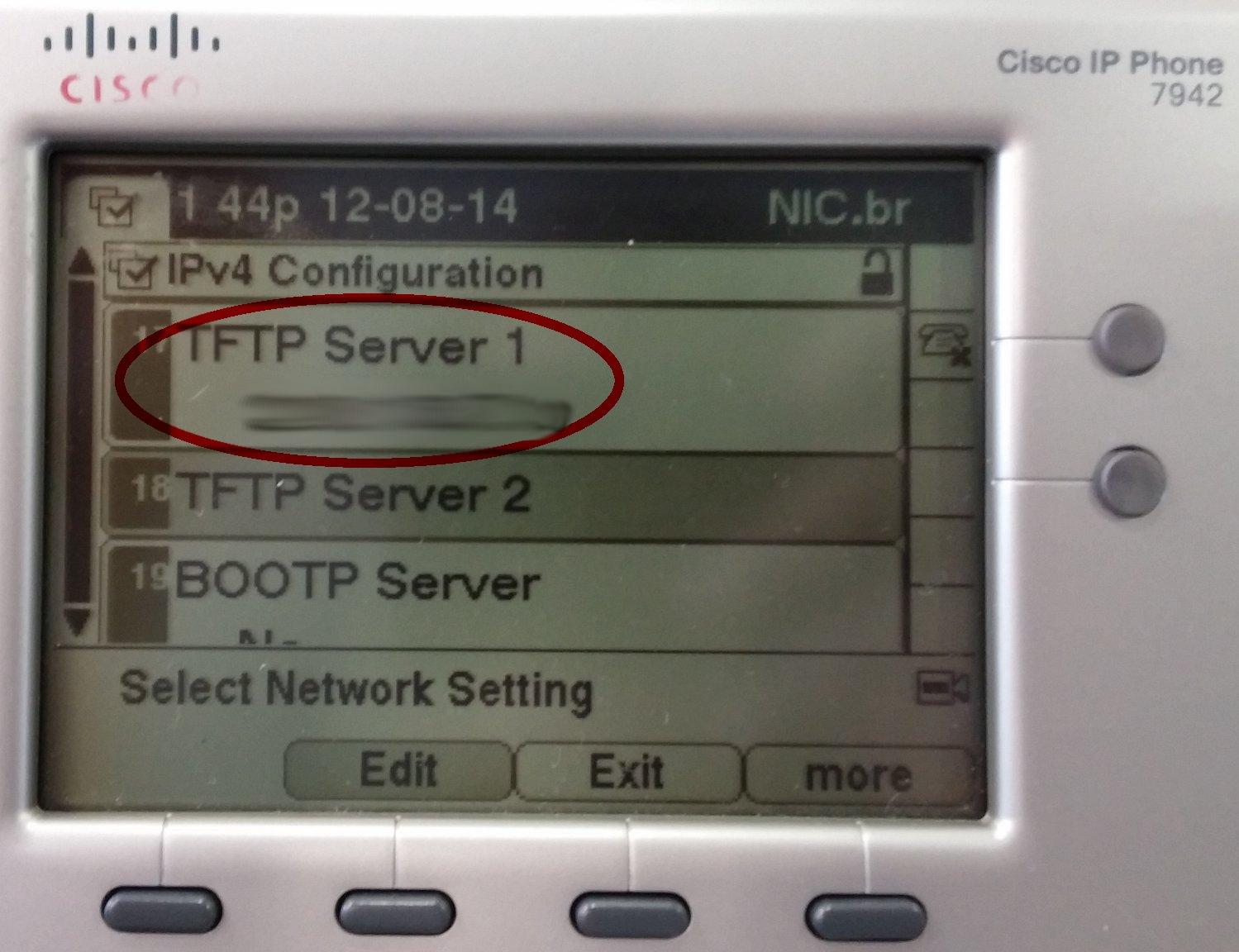 Caso seja necessário alterar esse IP, desabilite o DHCP no campo 1: DHCP, localizado no mesmo menu. Então será possível alterar o endereço do servidor TFTP para o endereço correto para o INOC-DBA: 200.160.1.27. Após alterar o campo e salvar as alterações, seu aparelho irá buscar as configurações no TFTP indicado. Pode ser necessário entrar em contato com a equipe do INOC-DBA, já que o servidor TFTP, por razões de segurança, não é acessível publicamente todo o tempo.