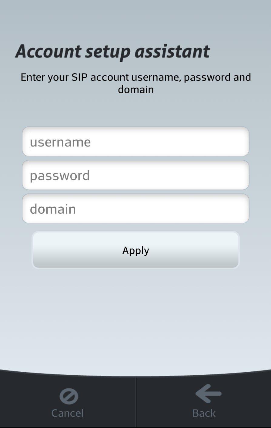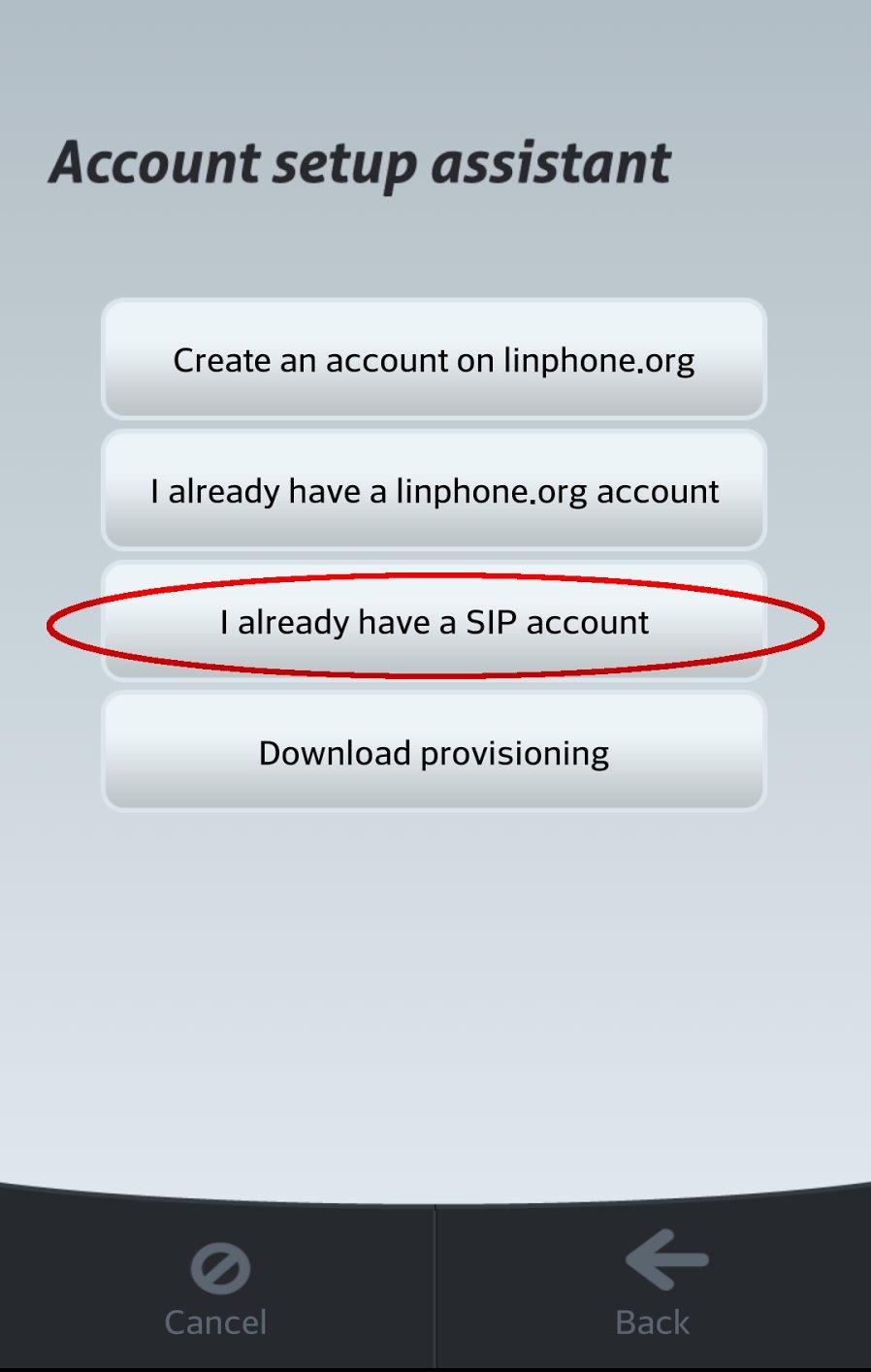 1. Quando o aplicativo é aberto, ele pergunta ao usuário se já possui uma conta SIP. Selecione a opção “I already have a SIP account”.