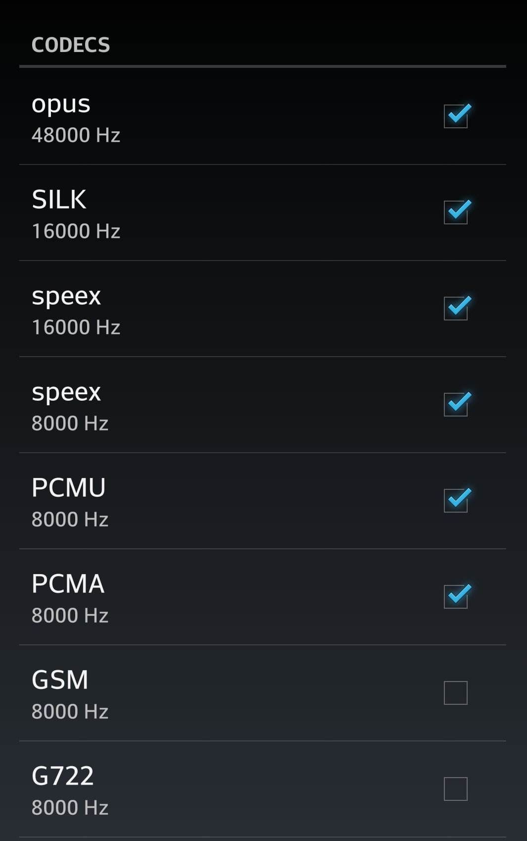 - Speex: Usa cerca de 35kbps, sendo apropriado a redes com pouca banda, como 3G. Tem uma qualidade de audio um pouco pior e é um pouco mais 'pesado' que os demais em termos de processamento.