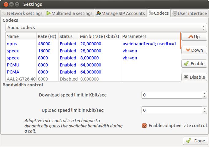 1. É possível escolher quais codecs serão usados pelo softphone e sua ordem de preferência. No INOC-DBA é possível utilizar os seguintes codecs: