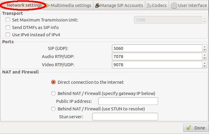 - Behind NAT/Firewall (use STUN to resolve) - Session Traversal Utilities for NAT: O servidor STUN ajuda a identificar o IP público do seu gateway automaticamente e a estabelecer a sessão SIP. Escolha essa opção em caso de dúvida! O INOC-DBA não oferece um servidor STUN, mas há diversos servidores públicos que podem ser utilizados. Por exemplo: stun.l.google.com, stun1.l.google.com, stun2.l.google.com, stun3.l.google.com, stun4.l.google.com, stun01.sipphone.com, stun.ekiga.net e stun.zoiper.com.