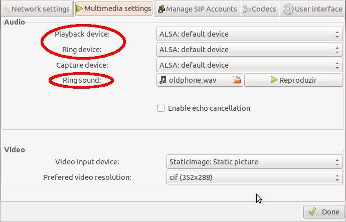 1. Na aba Multimedia settings, pode-se escolher quais dispositivos serão usados como entrada e saída de áudio e o toque de chamada do softphone.
