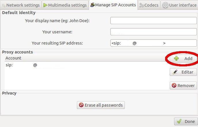 2. Nessa tela, clique em Add e então, preencha os seguintes campos com as informações da sua conta SIP: