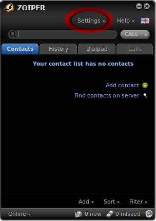 1. Abra o aplicativo Zoiper, para que a tela inicial seja apresentada. Clique no botão Settings e então, em Preferences.