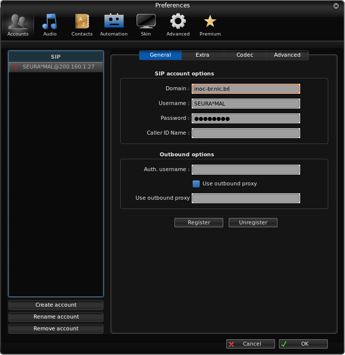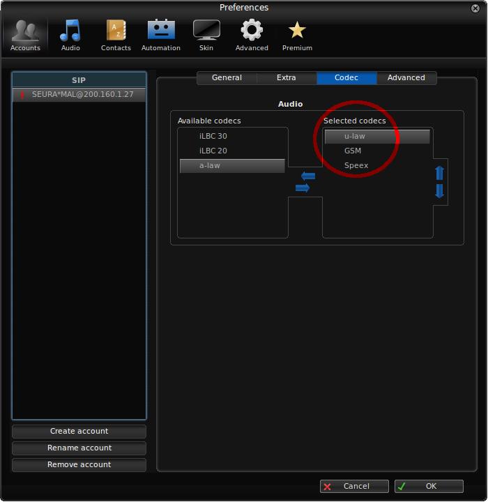 1. Ainda na aba Accounts, pode-se configurar os codecs de áudio de seu softphone. Com o INOC-DBA, pode-se usar os seguintes: