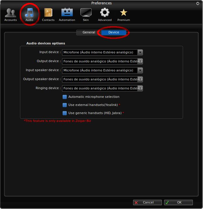 1. Na aba Audio, dentro do menu Device, pode-se escolher os dispositivos de entrada e saída de áudio que serão usados.