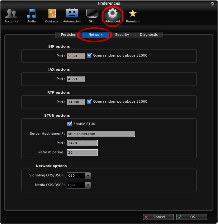 - SIP options: Escolha um valor entre 5060 e 5069 para Port.